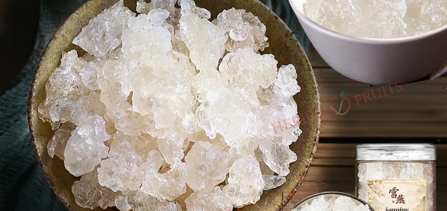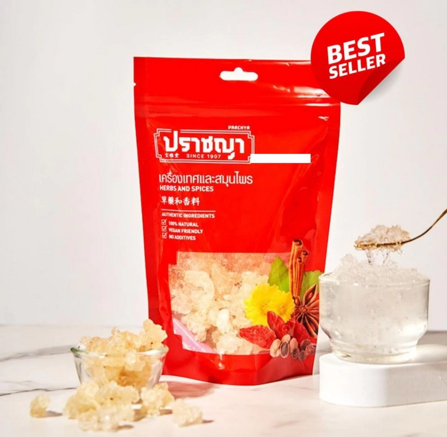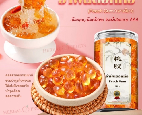 วัตถุดิบธรรมชาติที่ได้จากยางของต้นพีช ใสๆนุ่มหนึบ เคี้ยวเพลิน แถมยังให้ความรู้สึกเบาสบาย ไม่หนักท้อง นิยมนำไปต้มเป็นของหวาน ใส่พุทราจีน เก๋ากี้ หรือแปะก๊วย ยิ่งต้มยิ่งหอมละมุน ได้รสหวานธรรมชาติแบบพอดี